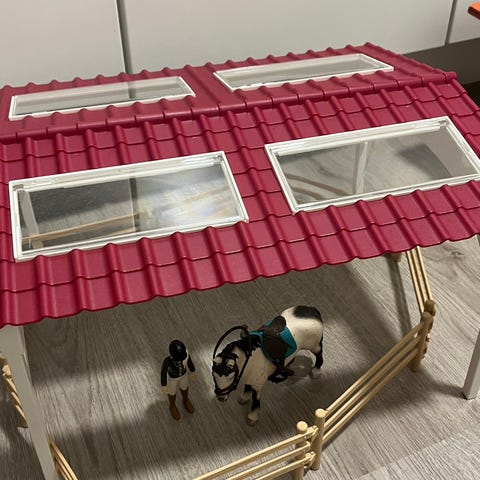 Schleich katos muurilla ja karsinoilla. Katoksen koko 23 cm x 19 cm. Leikitty. Hyväkuntoinen. Pk ostajalle.