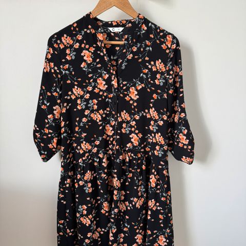 Sininen pohja, vaaleanpunainen kukkakuosi. Aivan ihana kevyt ja ohut paita, joka jäänyt minulle liian pieneksi. Pesulappu leikattu pois, mutta sanoisin että 100 % polyesteriä. Materiaali ei jousta.