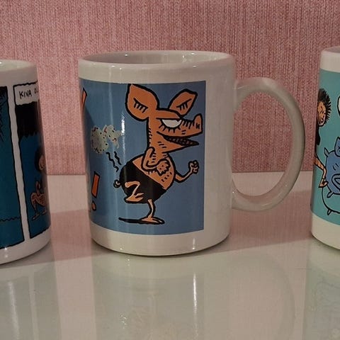 näkyy punapohjaisen mukin yhdessä ruudussa ja