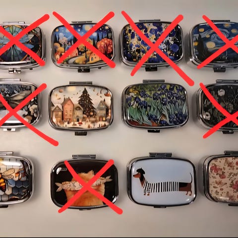 Myydään uudet kauniit pillerirasiat/korurasiat. Sisällä 2 lokeroa ja peili. Peltirasia. Erilaiset kuviot. Soveltuu lääkkeen dosetiksi tai korurasiaksi. Mitat: leveys n. 5.5 cm, pituus n. 4 cm, syvyys n. 1.5 cm. Kiva lahjaidea! Katso muitakin minulla myynnissä olevia ilmoituksia, paljon kivaa!:)