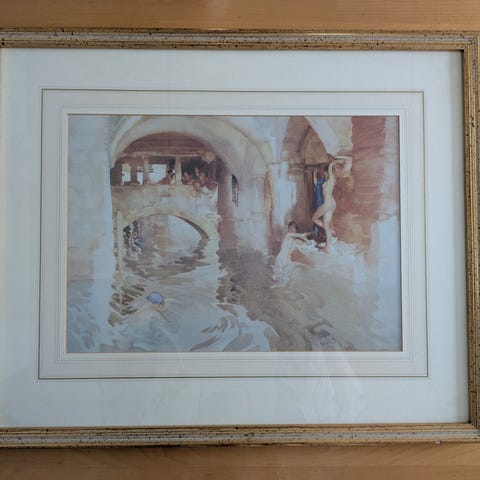 Michael Cadmanin vedos, jossa on sininen maisema. Taulu on kehystetty kultaisilla kehyksillä. Sopii sisustuselementiksi kotiin tai toimistoon. Taiteilijan signeeraus alareunassa. Työn korkeus on 42 cm ja leveys 32 cm. Kehys 58 X 48 cm.