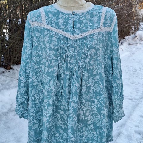 Kevyt ja väljänmallinen viskoosipusero pitkillä hihoilla. Paidassa on v-pääntie, jossa on kaulukset sekä yksi nappi. Helma kevyesti ”pussilla”. Kaunis kuosi ja mukava päällä.