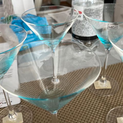 Tässä kohteessa myydään neljä (4) kappaletta elegantteja cocktail- tai coupelaseja. Malli ja suunnittelija tuntematon, hyvin todennäköisesti kotimaista tuotantoa. Veikkaus Göran Hongell Karhula Iittala. Erittäin kaunis kylmän sininen sävy korostuu valokuvassa.