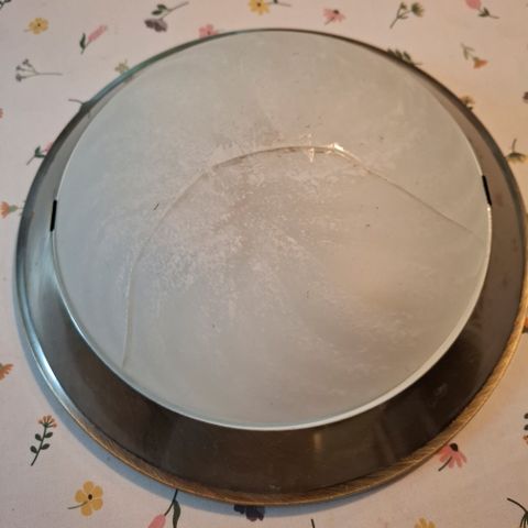 Hyväkuntoinen valaisin sokeripala-kytkennällä. Tällä hetkellä 97cm katosta, saa säädettyä ylemmäs tai alemmas. Lasikuvun halkaisija 40 cm. Pienempi kupu maitolasia.
