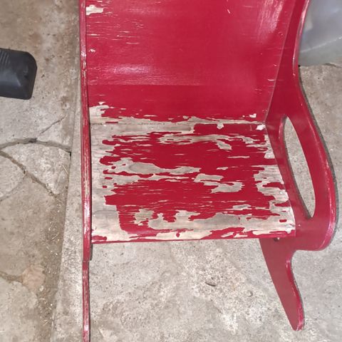 Tarpeeton. Valkoiseksi maalattu puinen lasten keinutuoli.
