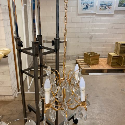 Metallia ja kristallia. Metalliosat luonnonvaaleaksi "antiikkimaalattuja" lehtiä. Korkeus n 50 cm ja halkaisija n 45 cm.