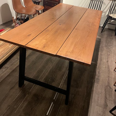Stina pöytä on moderni ja taipuu monenlaisiin tuoleihin.