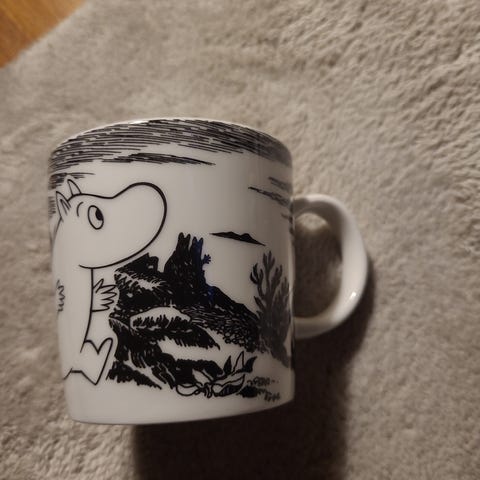 Arabia Muumi muki, jossa on raidallinen kuvio ja Muumi-hahmo. Paljon myös muita Muumi mukeja.