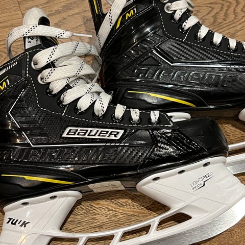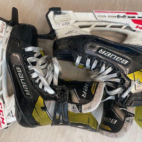 Kauden käytetyt Bauer Supreme M3 luistin. Päällä paljon kulumisen jälkiä.