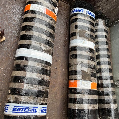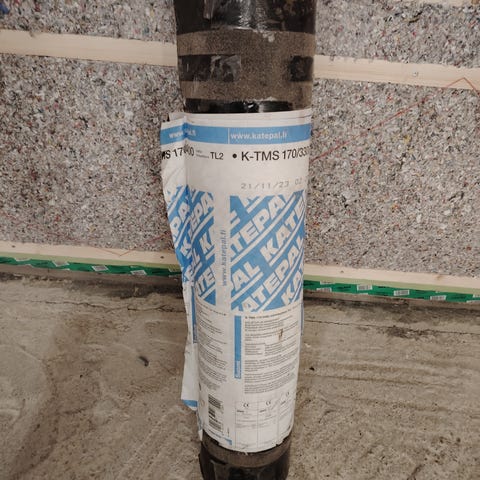 Yksi täysin rulla jäi katon rempasta yli. Katepal K-MS 170/3500 on hitsattava TL2-luokan aluskermi ammattikäyttöön. Tuotteen yläpinnassa on bitumipinta ja alapinnassa hitsausbitumi ohuen sulatettavan suojamuovin alla.