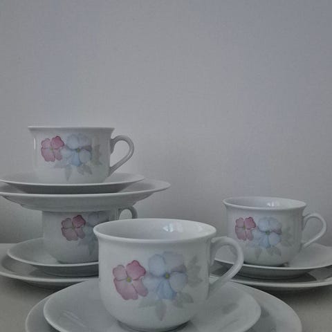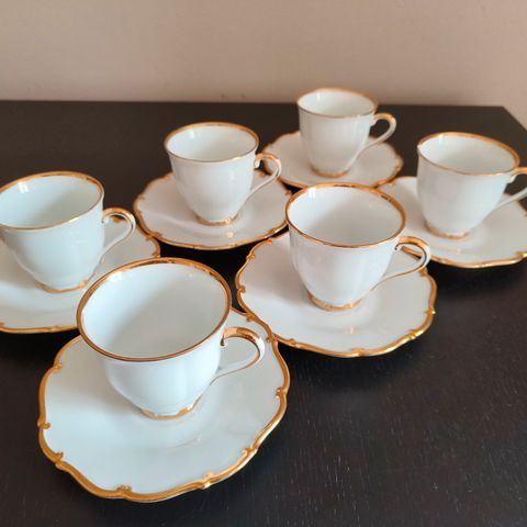 Laadukkaita saksalaisia kahvi-/teekuppeja, aluslautasia ja leipälautasia 10 kpl.