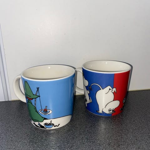 Käyttämättömät Arabia Muumi mukit 2 kol on valmistettu kestävästä keramiikasta. Mukien värikäs ja yksityiskohtainen kuvitus esittää Muumilaakson hahmoja ja maisemia (Nuuskamuikkunen, muumipeikko).