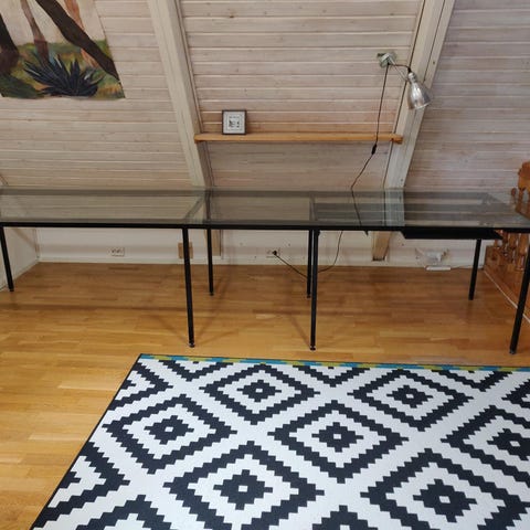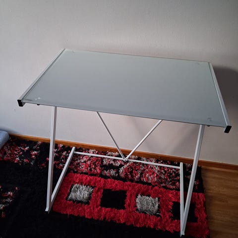 Myydään lasikantinen työpöytä. Jalat metallia. Lasikansi huurrelasia ja toiselta puolelta valkoinen ja liukaspintainen, voi pitää kummin päin vaan.