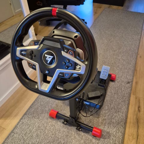 Thrustmaster T300RS GT Edition on ohjauspyörä ja poljinsarja. Kohtuu vähällä käytöllä ollut. Kuvissa näkyvä teline ei kuulu kauppaa mutta voidaan 30€ lisähintaan myydä mukaan.