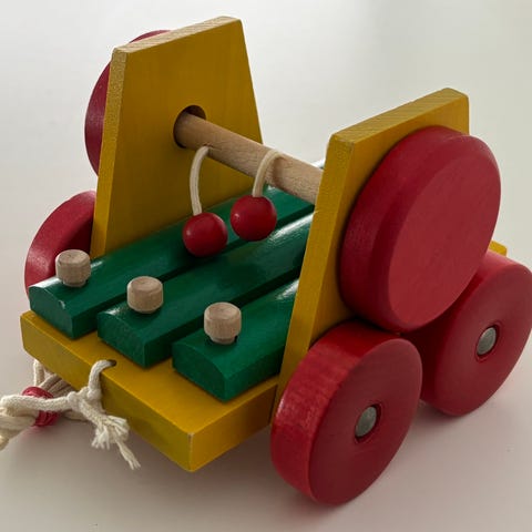 Puinen Juho Jussilan äänivaunu on värikäs lelu, joka yhdistää leikin ja liikkumisen. Narusta vedettäessä puupallot soittavat kauniisti soivaa, vienoa ”pimpeli-pompelia” osuessaan puukieliin.