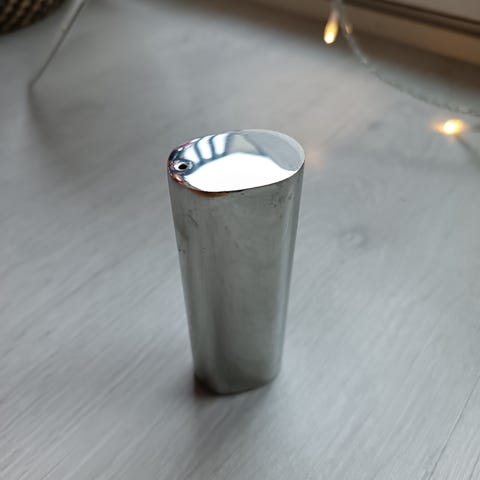 Kiiltää niin paljon että toimii lähes peilinäkin. Takana logo Seita, St. Steel 18/8 FINLAND