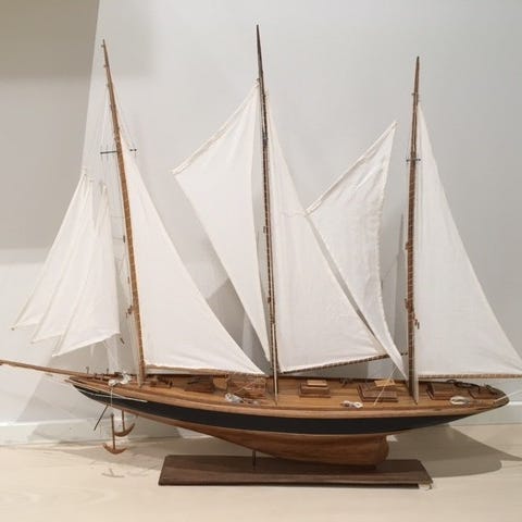 Kuvien mukainen pienoismalli, pituus n 42 cm, korkeus 41 cm. Etummaisen purjeen tukimasto poikki, korjattavissa. Nouto Ikaalinen tai Tampere