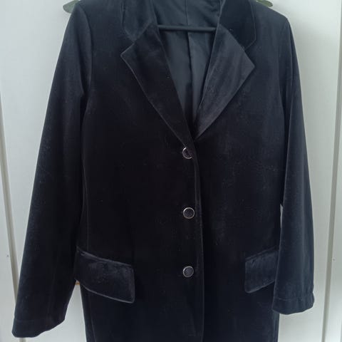 Kevyt, musta takki vaaleanbeigellä kuvioinnilla, 100% viskoosia. Kääntökaulus ja sivuilla taskut. Suora malli. Ehyt, siisti ja uudenveroinen. Mitat: olka-olka 40cm, olka-helma 65cm. Nouto tai ToriDiili.