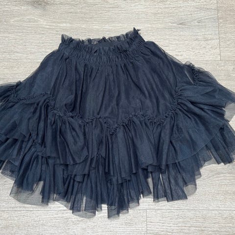 Tyttöjen tummansininen POMPdeLUX röyhelöhame, koko 122/128 cm. 100 % puuvilla, vyötäröllä kuminauharypytys. Erittäin hyvä käytetty kunto.