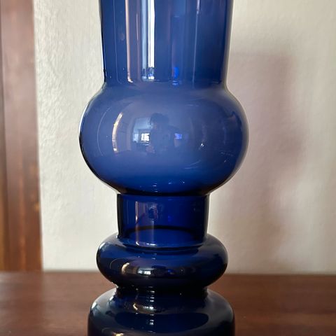 Kaj Franck tummansininen/kirkas maljakko KF-296 vuodelta 1964. Pohjassa signeeraus Nuutajärvi Notsjö. Korkeus 18 cm, reunan leveys 5,5 cm. Pohjassa siirtelyjälkiä, yhdessä yläkulmassa pieni kolhu, näkyy viimeisessä lisäkuvassa. Muuten virheetön kunto.