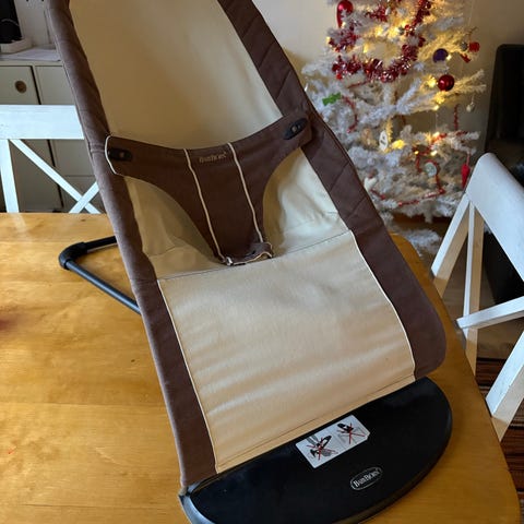 Hyvä BabyBjorn sitteri korkeus säädöllä. Käännettävässä kankaassa musta puoli on vain hiukan nukkanen ja ehkä vähän haalistunut. Raitapuoli on kuluneempi ja haalistunut pesussa.