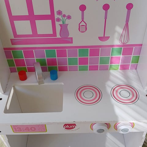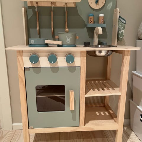 Puinen leikkikeittiö, jossa toinen puoli toimii nukkekotina.