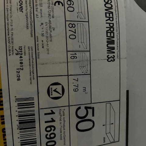 6 pakettia isover 565x1310x50 villaa. Noin 88,8m2
