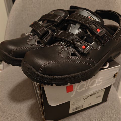 Uudet, kolmisen kertasma jalassa olleet työkengät, Jalas 5002 Menu black, koko 39. Olikin itselle liian kapea malli joten päädyin käyttämään aiempia työkenkiä. Pohjalliset irroitettavat ja käyttämättömät, käytössäni oli eri pohjalliset näissä kengissä.