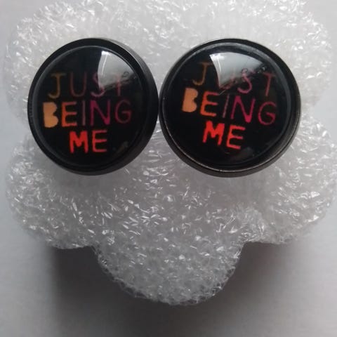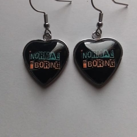 Uudet mustapohjaiset korvakorut värikkäällä tekstillä "stay weird", pituus koukun kanssa 3,5cm.