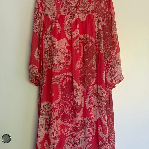 100 % viskoosimekko, A-malli tuo väljyyttä, lyhyet trumpettimalliset hihat, edessä nauhat ja olen pienentänyt kaula-aukkoa pienellä hakaneulalla..