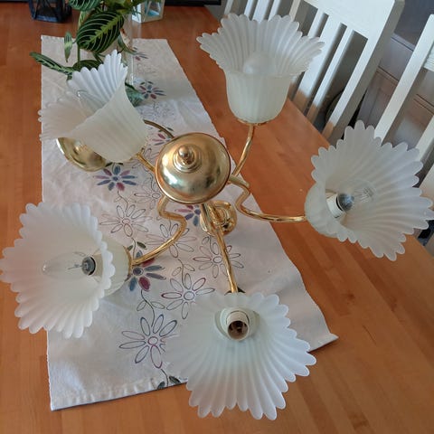Käyttämätön lamppu. Muovit edelleen ympärillä. styroksi ja laatikko saanu muutoissa ja avaamisessa osumaa. Muuten täydellinen. Valaisin on siis hope/lasi.