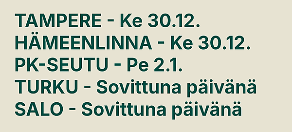 Hyödynnä ilmainen toimitus Turkuun, Helsinkiin, Tampereelle tai Hämeenlinnaan. Toimituspäivät julkaistu etusivulla.