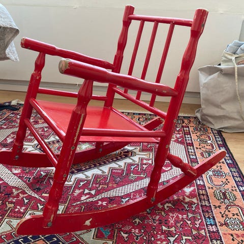 Myydään ihana lasten punainen keinutuoli, jossa on ajan patinan lisäksi kaunis kissakuva istuimessa. Suuntaa-antavat mitat (löytyvät myös viimeisestä kuvasta):