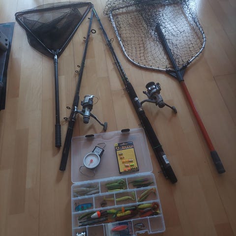 Kalastussetti, joka sisältää erilaisia vieheitä ja koukkuja. Setissä on useita värejä ja kokoja, jotka sopivat monenlaiseen kalastukseen. Mukana on myös kellukkeita ja muita tarvikkeita, jotka tekevät kalastamisesta monipuolisempaa.