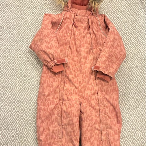 Yhden talven käytössä ollut lämmin toppahaalari. Hyvin pientä kulumaa polvien kohdalla, lahkeissa ja pepussa. Näkyy kuvissa.