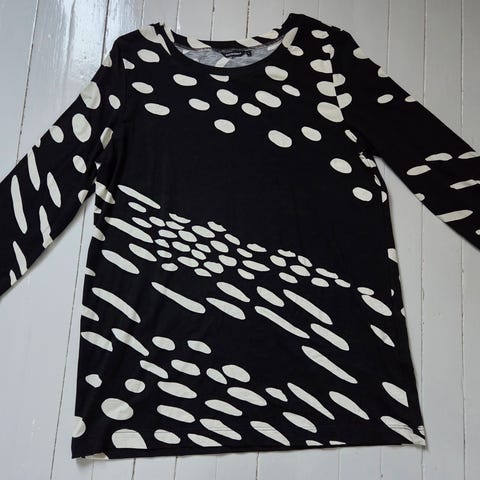 Marimekon mustavalkoinen piprut paprut kuosinen paita. Pehmeä ja joustava t-paita, pyöreä pääntie, 95% viskoosia ja 5% elastaania. Kunnoltaan oikein siistikuntoinen. Koko XL: kainalo-kainalo 60cm, olka-helma 60cm. Nouto tai postitus.