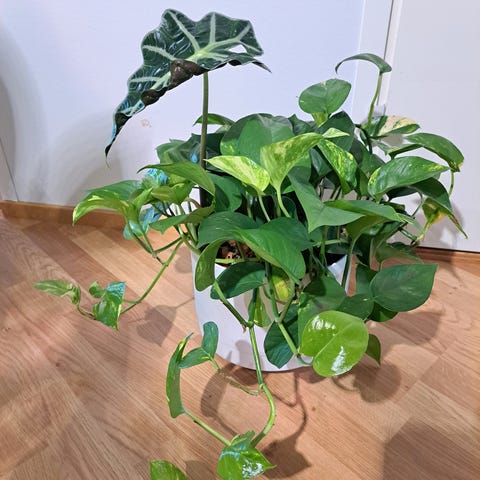 Kultaköynnös ja alokasia samassa altakasteluruukussa