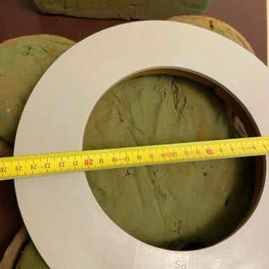 Kaksi muovissa olevaa muotoiltavaa kukkasientä. Lapset tosin pistelleet reikiä kuten kuvista näkyy. Kukka-asetelmien tekoon tai askarteluun.