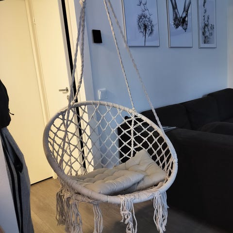 Hyväkuntoinen ja ehjä valkoinen kudottu riippukeinu. Mahtuu pieneen tilaan mutta sopii mainiosti aikuisen käyttöön.