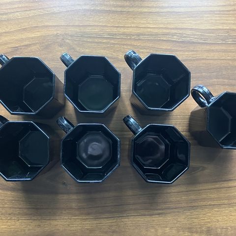 Kuusi mustaa Arcoroc Octime -kahvikuppia ja yksi kermakko. Käytetty mutta hyvä kunto. Nouto Lammi/Tampere.