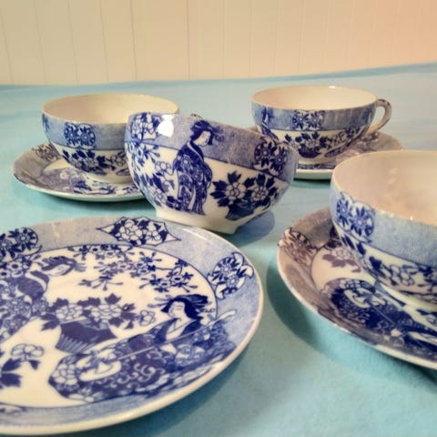Vanhat japanilaiset teekupit. 10 kuppia ja aluslautasta. Ohutta posliinia. Ehjät ja hyväkuntoiset.