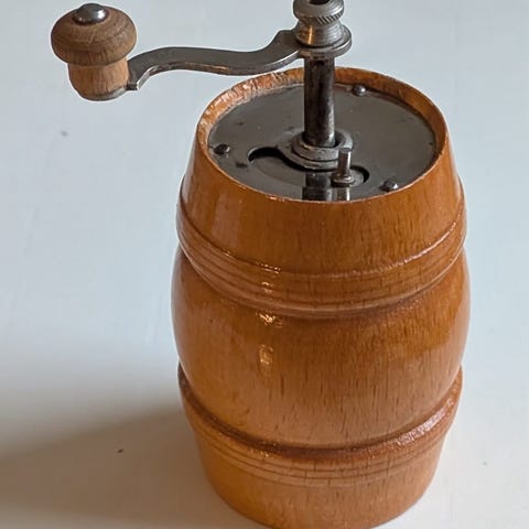 Vanha, tiikkinen pippurimylly metallisella koneistolla. Korkeus noin 20 cm kahvan kanssa.