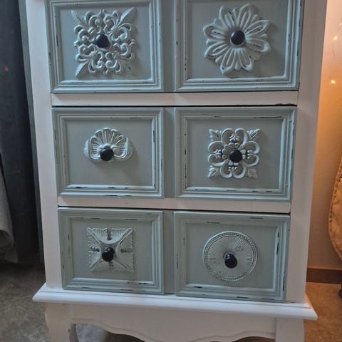 Vihreä lipasto, jossa 3 laatikkoa alapuolella ,avautuva etukansi, jossa pieniä säilytystiloja, yläpuolella hyllyt lasiovilla