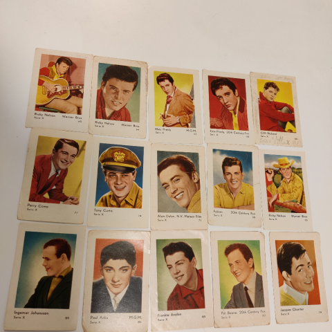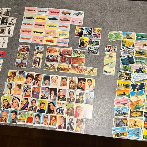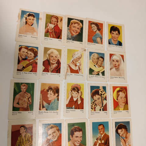 Hellas Jenkin ja Pandan keräilykortteja (purukumi) 60-luvun puolivälistä: Autot 24, viihde 22 ja urheilu 11 kpl.