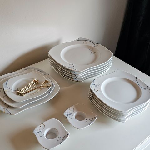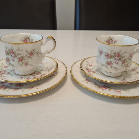 lautaspari, jossa on kukallinen kuviointi ja kultareunus. Lautaset on valmistettu posliinista ja niiden halkaisija on 12 cm. Sopii hyvin juhla- tai arkikäyttöön mm. teepusseille