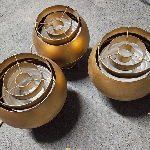 Yki Nummen suunnittelemat pallovalaisimet 70-luvulta. Kiinnitystapa on valaisinkiskon kiinnike, mutta mahdollista vaihtaa toisenlaiseen.