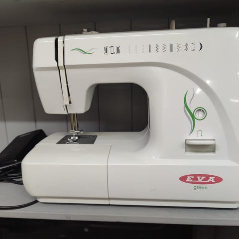 Eva-ompelukone. Kone toimii ja pöytä on siistikuntoinen, tukeva ja kätevä ommellessa.