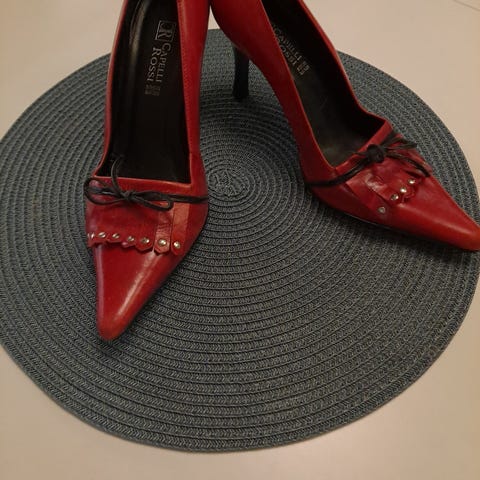 Lähes käyttämättömät kengät, sisätiloissa se vähäkin. Väriä vaikea sanoin kuvata, ehkä pronssiset. Koko 4.5 vastaa 37,5. Korko 6 cm. Itselleni harmittavasti naftit.