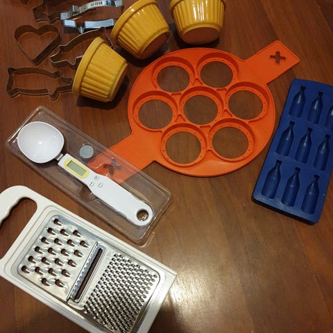 Sekalaisia keittiö tavaroita 6kpl munakuppeja, sushi muotti,raastin, lämpömittari, riisiotin.munankeitin keksimuotteja,taikina kaavin. puuharukka ja veitsi ja 6kpl haarukoita,korkinavaaja
