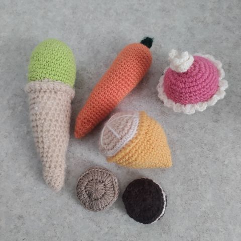 Myydään käsintehtyjä leikkileivonnaisia: kaksi virkattua donitsia, kaksi virkattua, kuorrutettua donitsia, virkattu kuppikakku, ommeltu kuppukakku ja virkattu jäätelötötterö. Kunto siisti. Pieniä leikin jälkiä. Voin myydä yksittäisiä leluja n. 1€/kpl.